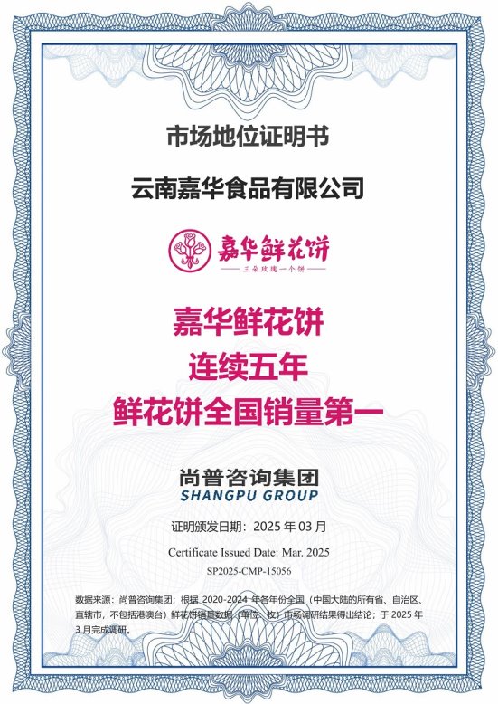 2025年3月,尚普咨询集团有限公司(以下简称“尚普咨询集团”)对中国鲜花饼市场进行深度调研,经专家和企业调研以及终端消费者交叉验证后,向云南嘉华食品有限公司颁发了“嘉华鲜花饼,连续五年鲜花饼全国销量第一”市场地位声明书。